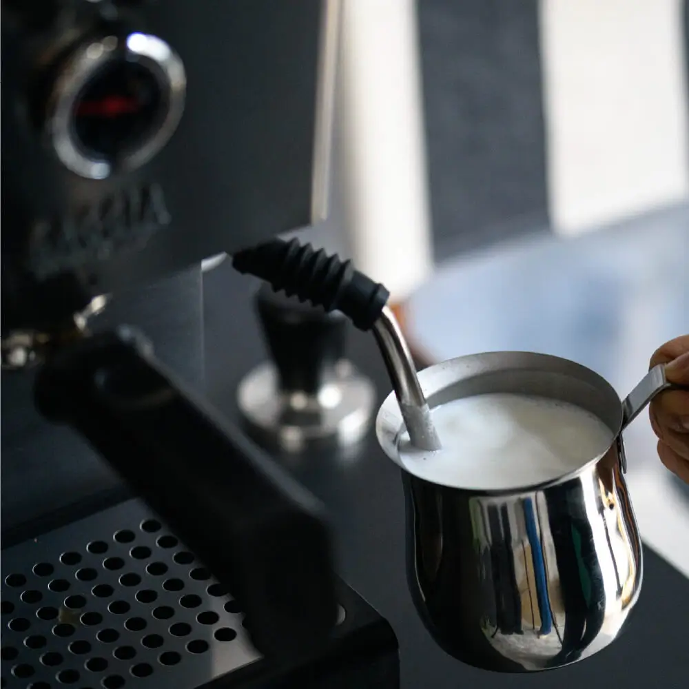 Fully articulated professional stainless steel steam wand, ideal for latte art