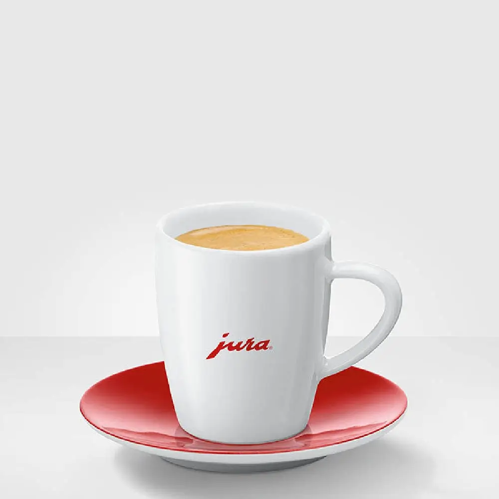 This cup and saucer set is a limited edition with a red colored saucer and the JURA logo on the cup.
