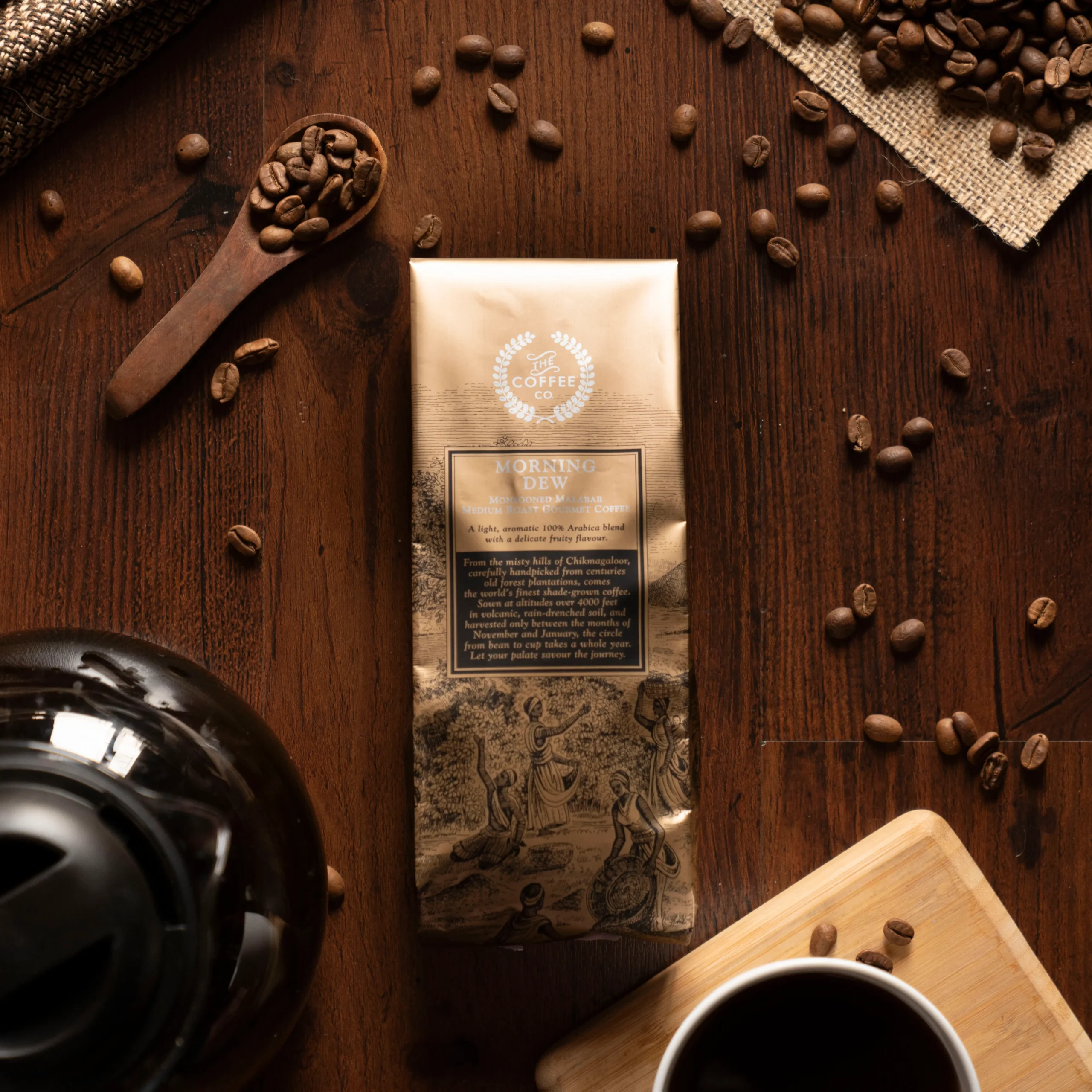 This distinctive coffee blend features Arabica coffee beans that have been naturally aged during the monsoon winds—a traditional Indian post-harvest process that reduces acidity and enhances smoothness.